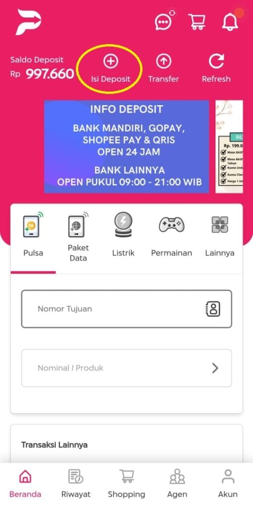 - Deposit berguna untuk melakukan transaksi pengisian pulsa.
